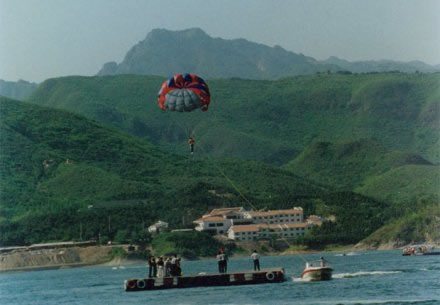 由泰國引進(jìn),跳傘平臺設(shè)在湖中,長40米,寬25米,總面積1000平方米。平臺浮在湖面上,由鐵錨固定在湖心。傘衣有兩種,可以根據(jù)游人的體重大小分別選用。游人在跳傘之前,平臺上穿好救生員和傘衣,傘衣由兩條高強度尼龍繩與傘和快艇相連,在快艇的高速牽引下,傘張開把人帶至空中,最高可達(dá)50米。隨著快艇的方向和速度,傘在空中時高時低,迂回曲折,在藍(lán)天碧水之間翱翔,湖區(qū)景色盡收眼底.