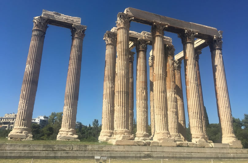 宙斯神廟 宙斯神廟位于希臘雅典衛(wèi)城東南面,是為了祭祀宙斯而建的,也是古希臘最大的神廟。宙斯神廟建于公元前470年,于公元前456年完工,由建筑師Libon設(shè)計(jì),宙斯神像則由雕刻家菲狄亞斯負(fù)責(zé)。直到公元前86年,羅馬指揮官蘇拉(Sulla)攻占雅典,破壞了尚未完成的建筑,將一部分石柱和其他建材拆下來之后,運(yùn)到羅馬。直到今天,在羅馬市中心的古羅馬廣場遺址上,還能看見它們。宙斯廟尤以象牙和黃金的塑像而聞名于世。 宙斯神廟是伊奧尼亞風(fēng)格的建筑,后來改用了科林斯式石柱風(fēng)格,而且一概使用大理石。整個(gè)建筑坐落在一塊205米長,130米寬的地基上,神廟本身長107.75米,寬41米,共有104根科林斯柱。每根石柱高達(dá)17.25米,頂端直徑達(dá)1.3米,約計(jì)用大理石1.55萬噸。和眾多的古希臘神廟一樣,宙斯神廟也遭受嚴(yán)重的破壞,104根柱子中僅存13根。宙斯神廟和哈德良拱門隔路相望,宙斯神廟位于路南,而哈德良拱門則位于路北,這兩座建筑都是由距今1900多年前的羅馬帝國國王哈德良時(shí)期修建的。我們已經(jīng)無法看到宙斯神廟和哈德良拱門的原始形態(tài),只能通過斷壁殘?jiān)珌砘貞洰?dāng)時(shí)的輝煌。