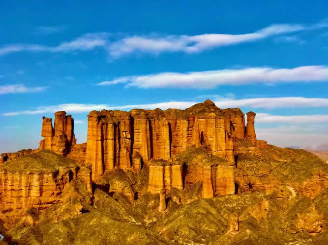 冰溝丹霞地貌以“雄、險(xiǎn)、奇、幽、美”而著稱,是大自然鬼斧神工的杰作,素有“赤壁千仞”之稱,被譽(yù)為“天下第一奇觀”,是攝影愛好者的天堂。其主要特點(diǎn)是:類型豐富,造型奇特,形態(tài)多樣,組合良好世間罕見。有窗欞狀、柱廊狀、泥乳狀、疊板狀、陡崖狀、蘑菇狀、蜂窩狀等多種地貌形態(tài),以宮殿式、劣地式、糧囤式為主。它具有一般丹霞地貌發(fā)育所表現(xiàn)出來(lái)的丹霞石柱、崖壁、石墻、巷谷、一線天、孤峰殘丘等代表丹霞地貌發(fā)育各個(gè)階段的形態(tài)特征,其地貌表現(xiàn)為峰林結(jié)構(gòu)其山石高下參差,疏密相生,群峰林立,組合有序,千姿百態(tài),富有韻律感和層次感,在造型上有很強(qiáng)的表現(xiàn)力、可視性、可塑性和極高的觀賞性,因此又被譽(yù)為“大西北的紅色石林”。