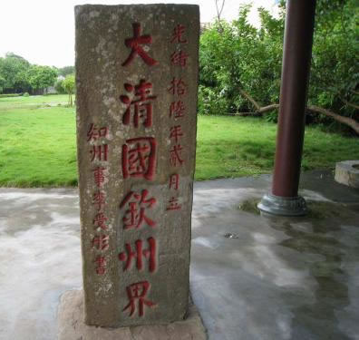 1885年6月9日,清政府與法國在天津簽定的《中法越南條約》規(guī)定,兩國邊界自竹山起,循北侖河出?谀媪鞫希院有臑榻缇。防城港市與越南的邊界線,從竹山的北侖河口至峒中的北崗隘,長200多公里,全段以石碑為標(biāo)志,共立1至33號界碑。竹山界碑是清光緒十六年(公元1890年)所立的第一塊界碑,故稱大清國一號界碑。100多年來,竹山一號界碑歷盡滄桑,屹立于北侖河口巋然不動,顯示了中國領(lǐng)土的神圣不可侵犯,故竹山一號界碑具有較高的歷史價值和現(xiàn)實(shí)意義。
