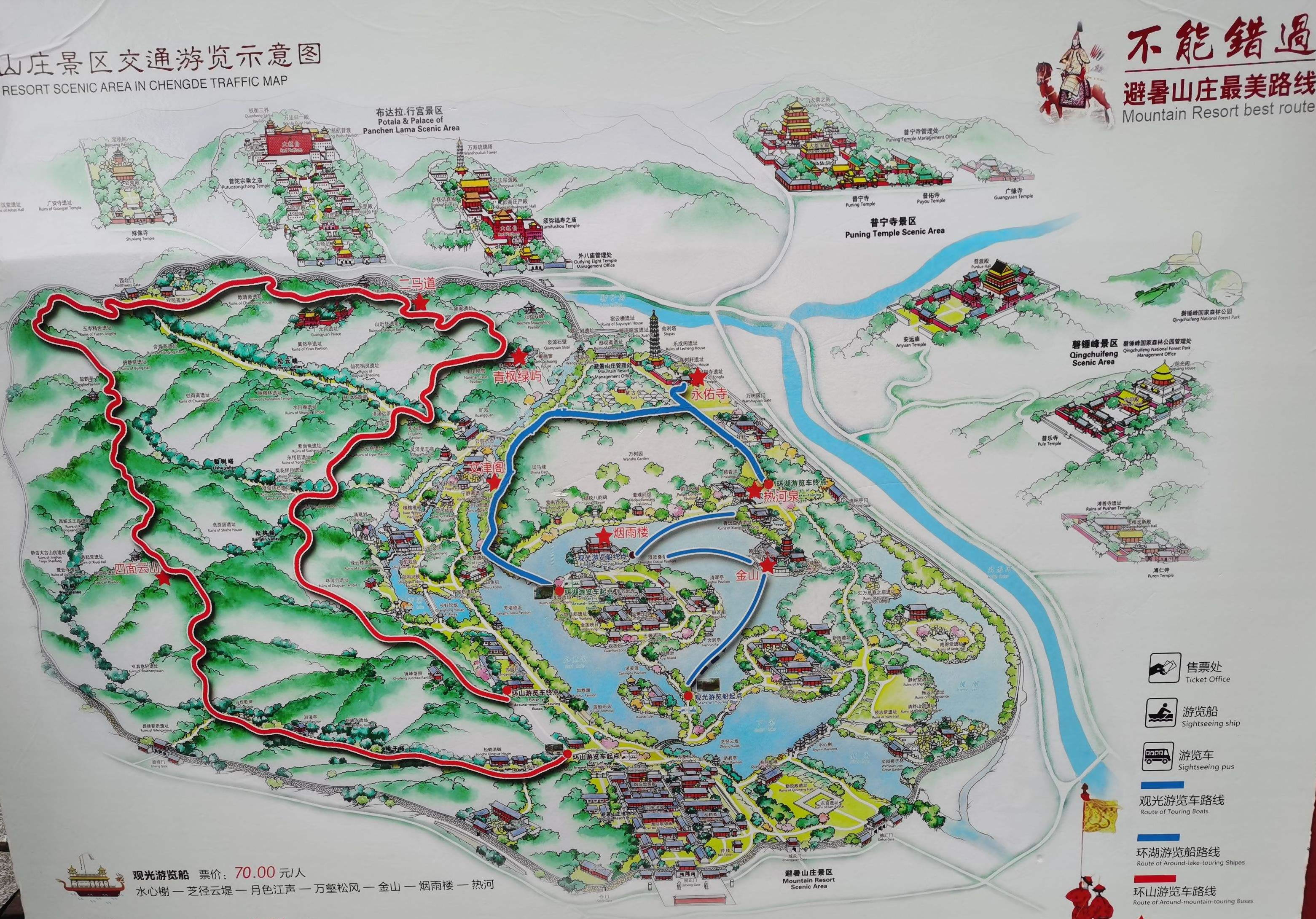 湖泊區(qū):苑景區(qū)的精華基本上在湖泊區(qū),康熙曾夸耀說(shuō),“天然風(fēng)景勝西湖”。由于洲島錯(cuò)落,湖面被長(zhǎng)堤和洲島分割成5個(gè)湖,各湖之間又有橋相通,兩岸綠樹(shù)成蔭,山莊主要的風(fēng)景建筑又都散落在湖區(qū)的周圍,因此顯得曲折有致,秀麗多姿。湖泊區(qū)位于山莊東南,面積49.6萬(wàn)平方米。有大小湖泊八處,即西湖、澄湖、如意泅、上湖、下湖、銀湖、鏡湖及半月湖,統(tǒng)稱為塞湖。 湖區(qū)的風(fēng)景建筑大多是仿照江南的名勝建造的,如“煙雨樓”,是模仿浙江嘉興南湖煙雨樓的形狀修的。金山島的布局仿自江蘇鎮(zhèn)江金山。湖中的兩個(gè)島分別有兩組建筑,一組叫“如意洲”,一組叫“月色江聲”!叭缫庵蕖鄙嫌屑偕、涼亭、殿堂、廟宇、水池等建筑,布局巧妙,是風(fēng)景區(qū)的中心。“月色江聲”是由一座精致的四合院和幾座亭、堂組成。每當(dāng)月上東山的夜晚,蛟潔的月光,映照著平靜的湖水,山莊內(nèi)萬(wàn)籟俱寂,只有湖水在輕拍堤岸,發(fā)出悅耳的聲音,“月色江聲”的題名便是由此而來(lái)。湖泊區(qū)集南方園林之秀和北方園林之雄,將江南園林的景觀移植到塞外。區(qū)內(nèi)湖泊總稱“塞湖”,總面積57公頃。
