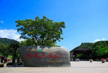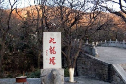 九龍橋是因?yàn)樯缴嫌芯艞l山澗像九條舞動(dòng)著的龍,從四面八方匯集于橋下而得名。那時(shí)候百姓都相信龍是神,一些香客就在此橋小憩一刻,來(lái)沾一點(diǎn)龍的壽氣,再進(jìn)山求佛,保全家萬(wàn)事平安,因此九龍橋又叫萬(wàn)壽橋。傳說(shuō)花果山上原來(lái)有十條龍,九條龍?jiān)谏嚼锩孀≈瑸榱朔乐雇庾迩址,便派了一條本事最大的禿龍到東面的山頭守衛(wèi)。山東莊還有禿龍山,那龍山上還有兩個(gè)對(duì)穿的山泉就是傳說(shuō)中的龍耳。我們可以在橋上往南望,那遠(yuǎn)處的村莊便是山東莊。九龍橋畔有一棵千年老銀杏,粗大的枝椏已經(jīng)擠進(jìn)了橋身,橋上橋下布滿樹蔭,給游客提供了休息納涼的理想場(chǎng)所。