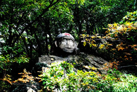 大圣佛是在自然石的基礎(chǔ)上,鑿刻而成的孫大圣頭像,供孫大圣的信仰者祭祀。孫悟空保護(hù)唐僧西天取回真經(jīng),功德圓滿,被如來(lái)封為斗戰(zhàn)勝佛,地位已遠(yuǎn)遠(yuǎn)高于觀音菩薩。斗戰(zhàn)勝佛,顧名思義是好斗善斗,而且是凡斗必勝。在人們心目中,孫悟空就是正義的象征,智慧的象征。每年臺(tái)灣地區(qū)和東南亞各國(guó),都有很多進(jìn)香團(tuán)到花果山來(lái)朝拜孫大圣。