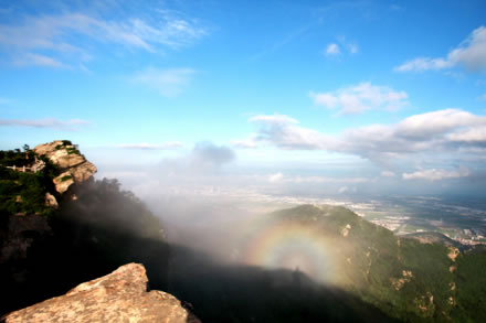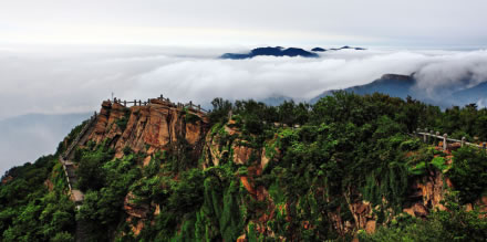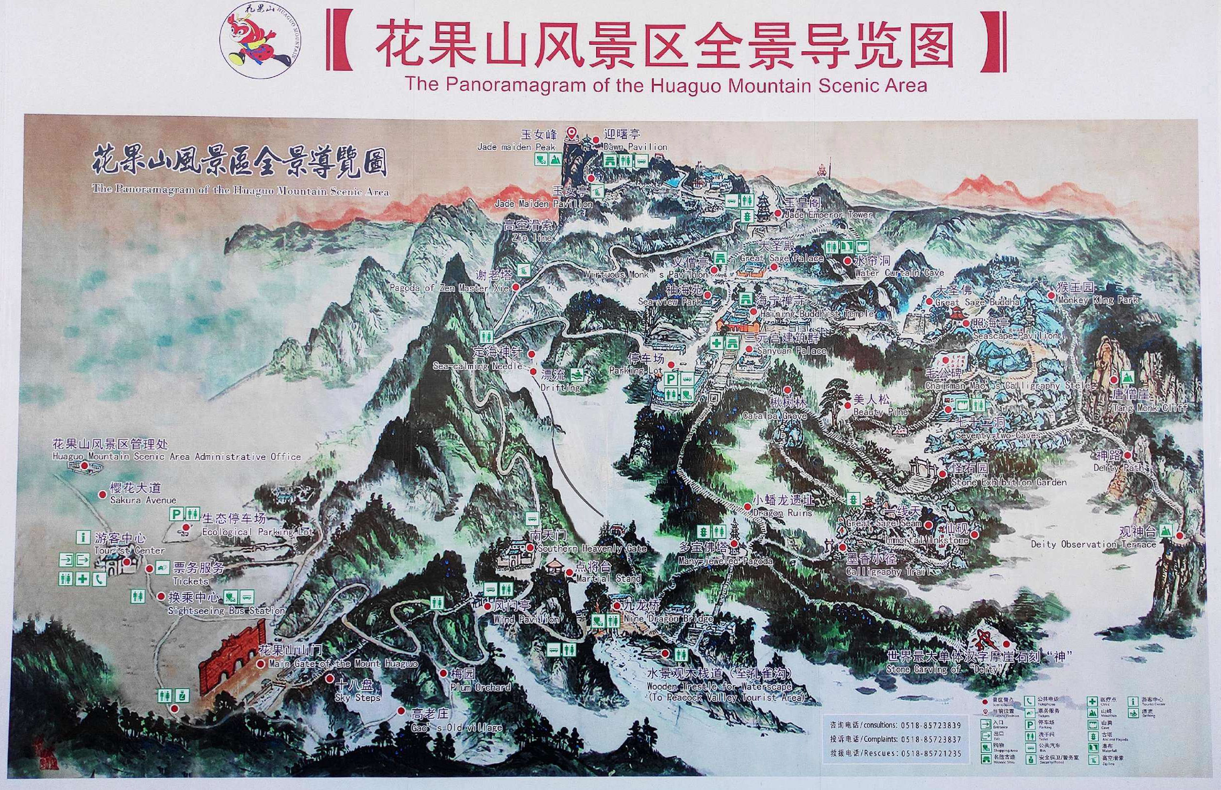 從遠(yuǎn)處山腰眺望一線天,這里就是著名的八戒石.很像一個(gè)戴著僧帽的老豬在綠樹叢中呼呼大睡。一線天下面是花果山山名摩崖石刻,游客都愛在這里留影,青山紅字,非常壯麗。這里還有天然碑、硯石等景觀。沿小路前進(jìn)可至墨香小徑,里面有百余位當(dāng)代書法名家的作品刻在天然石塊上;還可至怪石園,看千奇百怪與《西游記》有關(guān)的象形石!吧瘛弊滞踉跂|部禿龍溝下,是刻在山體上的懷素草書“神”字,長(zhǎng)39.4米、寬15.8米,為世界上最大的單體漢字,1996年被載入吉尼斯世界紀(jì)錄。 登上玉女峰是花果山之游的高潮,有緣的人在這里可看到云臺(tái)山兩個(gè)最為精彩的景致。一個(gè)是在迎曙亭看海上日出;另一個(gè)是看云臺(tái)鋪海,白云翻滾好像海水揚(yáng)波,露出來(lái)的峰頂就像大海里的蓬萊仙島,群山俯伏,阡陌縱橫,此情此景令人有飄飄欲仙的感覺。