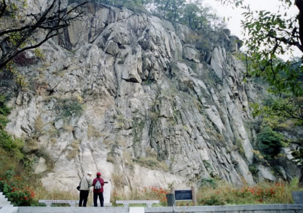 唐僧崖,又叫“大佛崖”,是由片麻巖石風(fēng)化而成的一堵高達(dá)數(shù)十米的峭壁陡崖。站在三元宮停車場(chǎng)東望,即可見唐僧和孫悟空師徒倆立在崖上的形象:唐僧兩耳垂肩,佛眼微閉,背稍躬,好像正在肅目修行;右旁一天然石猴,似乎在與唐僧耳語(yǔ)。神采逼真,栩栩如生。走到近前,由于崖壁紋理復(fù)雜多彩,還可以看到許多奇景點(diǎn)綴其間,有師徒對(duì)話、舍身飼虎、獨(dú)角鬼王等,所以有人又把它叫做“萬(wàn)佛崖”。