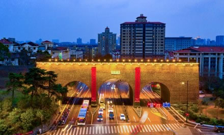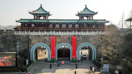 太平門位于玄武湖東南角,是南京明城墻十三座明代京城城門之一,是明朝京師應(yīng)天府京城的正北門,城門東側(cè)城墻被稱為“龍脖子”。復(fù)建后的太平門為方便交通改為三孔城門,主門洞設(shè)四股車道,兩個(gè)輔門洞各設(shè)兩股,城門寬約72米。