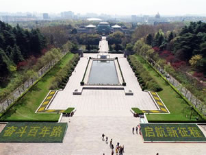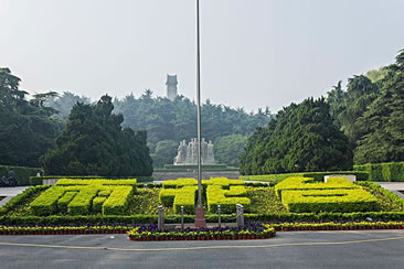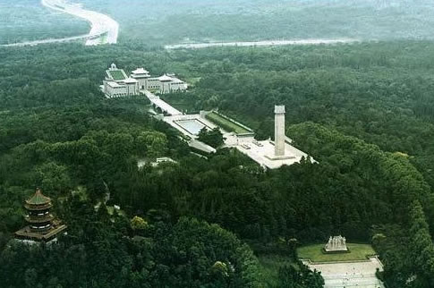 兩側(cè)的環(huán)陵大道可直達雨花臺主峰,主峰上矗立著一塊42.3米高的石碑,碑身正面鐫刻著鄧小平親筆題寫的"革命烈士紀念碑"七個金字,背面刻著紀念碑文。碑前還豎有一座高5.5米的烈士青銅塑像。在紀念碑南邊的山崗上還有一座呈"U "字型,頗具民族風(fēng)格的花崗巖結(jié)構(gòu)的大型建筑--"革命烈士紀念館"。館長94米、寬49米,主堡高26米,建筑面積5900平方米,館內(nèi)陳列著烈士們的遺像、遺書和遺物等。