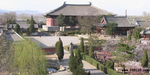 奉國(guó)寺:坐落在遼寧省義縣城內(nèi),始建于遼開泰九年(公元1020年)因殿內(nèi)塑有七尊大佛,又俗稱大佛寺。奉國(guó)寺由山門、牌坊、無(wú)量殿、鐘亭、碑亭、大雄殿、西宮禪院等古建筑構(gòu)成,占地3萬(wàn)平方米,是一座宏偉壯觀,保存較為完整的古代寺院。大雄殿位于中軸線的北端,面寬9間,通長(zhǎng)55米,進(jìn)深5間,通寬33米,總高度24米,建筑面積1800多平方米。它不僅是國(guó)內(nèi)遼代遺存最大的木構(gòu)建筑,因其大雄殿規(guī)模面積全國(guó)最大,又堪稱中國(guó)寺院第一大雄寶殿。