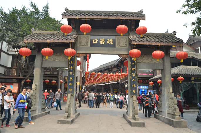 磁器口古鎮(zhèn),原名白巖場,也稱龍隱鎮(zhèn),地處重慶市沙坪壩區(qū)東北部,嘉陵江畔磁南街1號。北距沙坪壩中心5千米,重慶市中心14千米,南距石井坡3千米。古鎮(zhèn)總面積32.5萬平方米,景區(qū)核心面積分布于馬鞍山東側(cè)和東南側(cè),有14.3萬平方米。磁器口古鎮(zhèn),始建于宋真宗咸平年間,在清朝及民國時期得到飛速發(fā)展;1958年后,隨著水運交通逐漸蕭條,古鎮(zhèn)日漸衰落;20世紀末,憑借古鎮(zhèn)旅游潮流,磁器口古鎮(zhèn)又再次得到發(fā)展。它是重慶主城區(qū)內(nèi)唯一的規(guī)模最大、最具巴渝傳統(tǒng)民居、民俗、民風特色的古鎮(zhèn)。古鎮(zhèn)上傳統(tǒng)的民居建筑、石梯街巷、遺存的寺廟宮觀,是巴渝山地民居建筑的天然博物館。磁器口古鎮(zhèn)依山而建,由山起城。以磁器口正街和橫街為骨架,42條巷道垂直于正街和橫街向馬鞍山脊和溪溝邊緣呈枝狀發(fā)展,形成特征明顯的樹枝狀平面格局。古鎮(zhèn)的主要景點有翰林院、鐘家院、寶善宮、寶輪寺、黃桷坪牌坊等。
