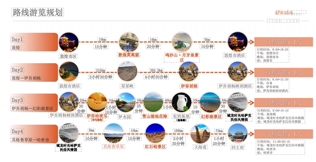 線路三“千里西域行”則以“千年敦煌·萬(wàn)年胡楊”——烏魯木齊至敦煌絲路星辰探索之旅為主題,該線路亮點(diǎn)為敦煌莫高窟、鳴沙山、伊吾胡楊、北疆自然風(fēng)景觀光和民族文化體驗(yàn)等。全程路線大約2202.6公里