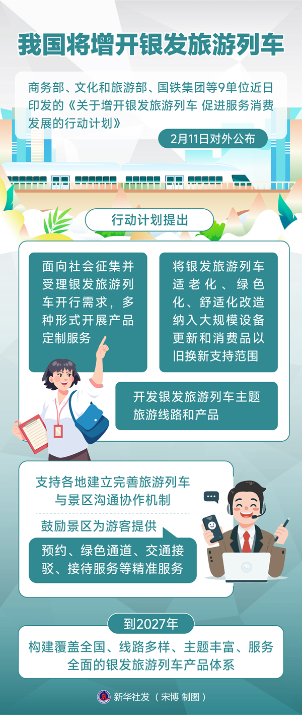 商務(wù)部、文化和旅游部、國(guó)鐵集團(tuán)等9單位近日印發(fā)的《關(guān)于增開(kāi)銀發(fā)旅游列車 促進(jìn)服務(wù)消費(fèi)發(fā)展的行動(dòng)計(jì)劃》11日對(duì)外公布,從增加銀發(fā)旅游列車服務(wù)供給、強(qiáng)化適老化設(shè)施保障、提升銀發(fā)旅游列車服務(wù)水平、優(yōu)化銀發(fā)旅游列車發(fā)展環(huán)境等方面提出12條具體舉措。