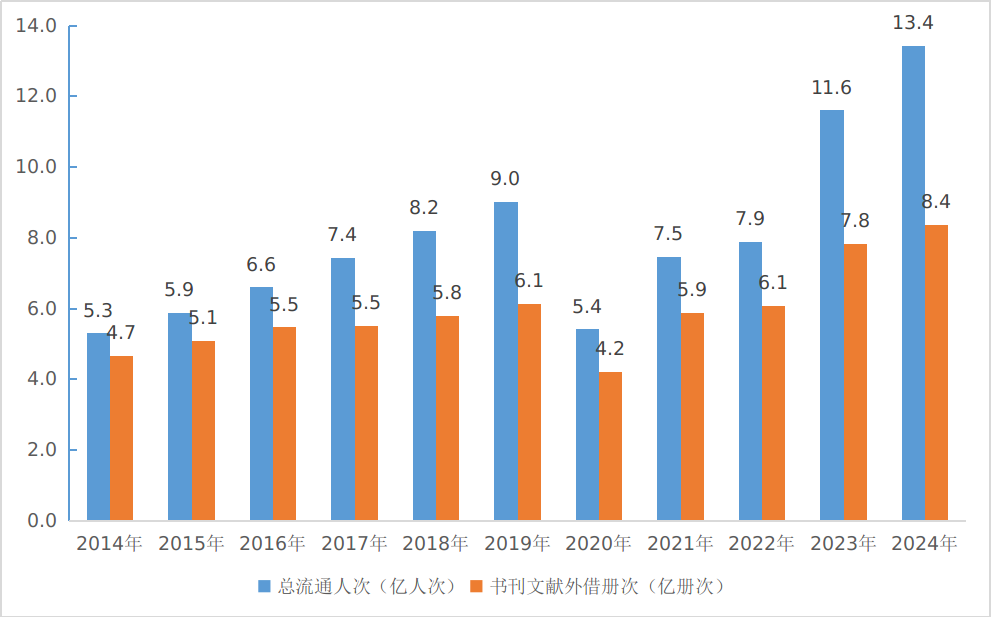 圖2:2014—2024年全國公共圖書館總流通人次及書刊外借冊次