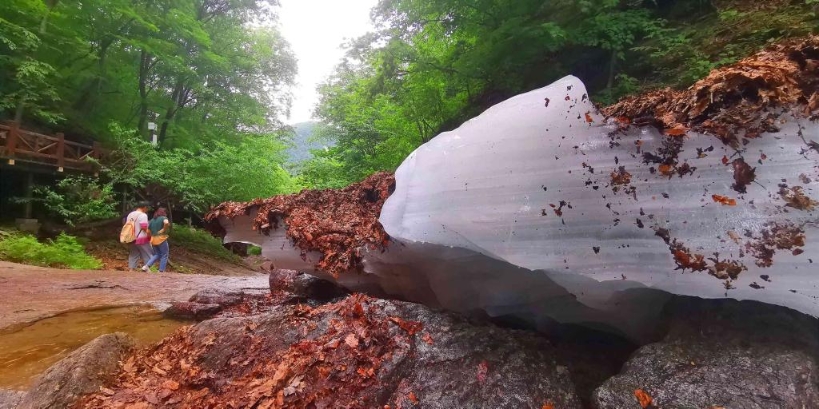 景區(qū)工作人員介紹,大冰溝森林公園地處中溫帶低海拔地區(qū),屬峽谷地貌,冬天山泉凍結(jié)成厚厚的冰蓋,第二年8月才會完全消融,形成了夏季“冰瀑”奇觀。游客行走在森林公園中,不禁為“左手盛夏右手冬”的奇妙體驗折服。