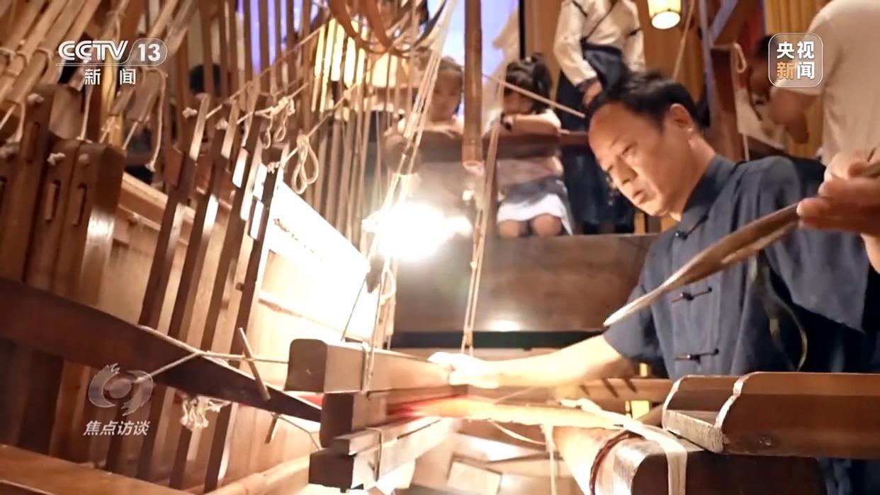 蜀錦省級非遺傳承人 曹代武:梭子從這個開口里邊過來,然后我就把緯線編織到里面了,織出來就是你現(xiàn)在看到的這個唐代的五彩鳥紋樣。再來一梭,一梭一梭的,就這樣反反復(fù)復(fù)。