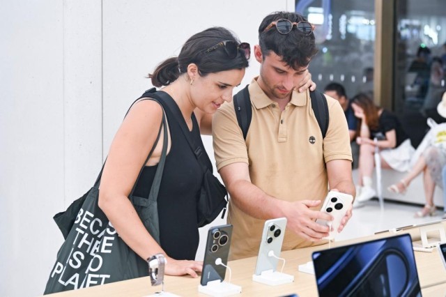 7月17日,兩名西班牙游客在位于上海市南京路步行街的華為商店里瀏覽手機產(chǎn)品。新華社記者 陳浩明 攝