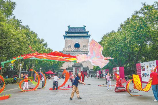 古老的鐘樓前,市民舞動(dòng)龍鳳彩帶健身休閑,傳統(tǒng)韻味與現(xiàn)代活力在此交融。 本報(bào)記者 武亦彬攝