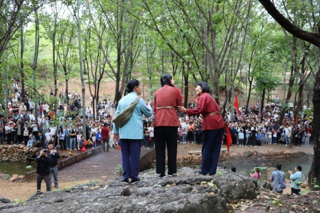 國慶中秋長假期間,游客在山東紅嫂家鄉(xiāng)旅游區(qū)觀看演出。新華社發(fā)