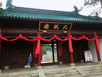 大觀樓是賈元春省親時,游罷大觀園各處院落之后,與家人相聚的地方。賈元春省親,是值賈府興盛的頂峰。高十五米重檐歇山頂?shù)拇笥^樓是這組建筑群在中心,是典型的皇家苑圃。