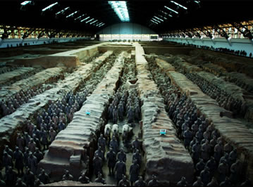 兵馬俑坑位于秦始皇帝陵東側(cè)1.5公里處西楊村南,是秦始皇帝陵的陪葬坑。已發(fā)現(xiàn)三座,分別編為一、二、三號兵馬俑坑。三座俑坑占地面積達2萬多平方米,內(nèi)有和真人、真馬大小相似的陶俑、陶馬近8000件。有車兵、騎兵和步兵等不同的兵種,排列整齊有序。