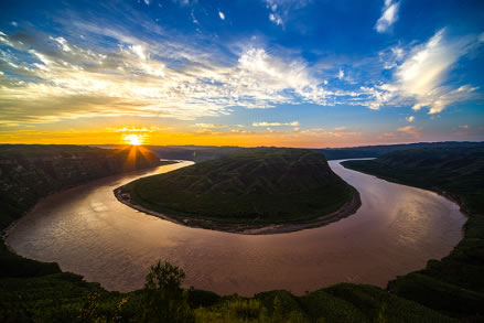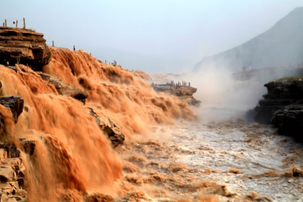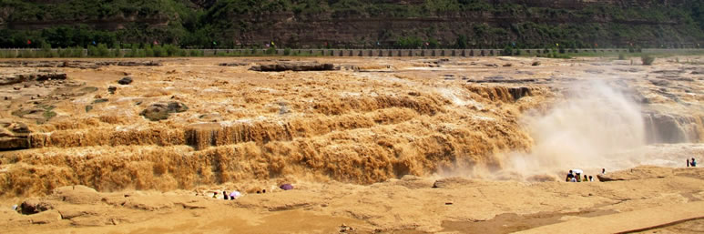 黃河在延安市延川縣眼岔寺鄉(xiāng)馬家騫村入?yún)^(qū)境,自北而南沿東界流經延長縣安河、羅子山、南河溝,在宜川縣猴兒川口出境,長183千米。在宜川縣城東48千米處,黃河由200—300米寬收縮到50米,突然跌入34米深的壺形峽谷,形似巨壺沸騰,十分壯觀,稱之為宜川壺口瀑布。