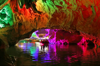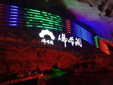 由南天門往右,沿著崎嶇的“盤陀路”進(jìn)入第二殿,隨著“一柱廳”、“半天山”到達(dá)約有450平方米寬的“東海龍宮”那里“定海神針”直立,“五彩神泉池”水色清澈晶瑩,不寒而栗有“白龍?jiān)浇瓓Z寶”、“頑猴望”、“海獅戲蓮”、“別甲神鷹鎮(zhèn)金沙”、“龍王百寶箱”等天然造型,氣勢(shì)磅礴,極為壯觀。龍宮內(nèi)洞中有洞、景中有景。“武陵園”有牛角尖、簸箕天,海螺洞中有“鶴蚌相爭(zhēng)”、“海螺觀戰(zhàn)”、“鳴鑼助戰(zhàn)”、“石床”等石筍、鐘乳石造型,相映成趣,目不暇接。然而,“山有洞天不算奇,陰河劃船數(shù)第一”。沿著灣灣曲曲的跳蹬路,耳聽潺水聲,觀看“地海橫鯨”、“青蛙駝蓮”、“天地桃”、“美猴照鏡”等景點(diǎn)來到陰河劃船處——“凱旋門”、只見幽幽碧水,微泛漣漪,各種燈光倒映水中的燈景冉冉浮動(dòng)。