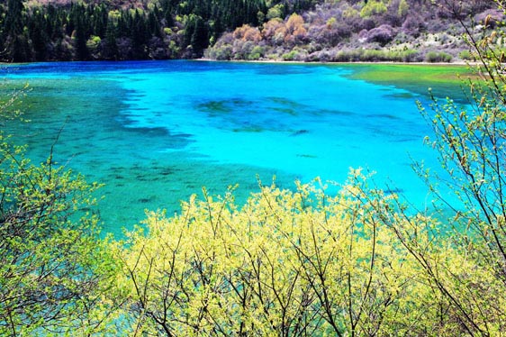 春風(fēng)吹拂,沉睡的九寨溝蘇醒了。冰雪融化,新綠發(fā)芽,春水的顏色映著山色,嬌嫩得讓人不忍探視,仿佛只要輕輕地一口氣都能讓它消失。水邊道旁,鬧哄哄開滿了不知名的美麗山花,桃紅、絳紫、靚藍(lán)、鵝黃,繁華似錦,爛漫一路。溫柔而慵懶的春陽吻接湖面,愛撫春芽,也悸動了你久閉的心門......
