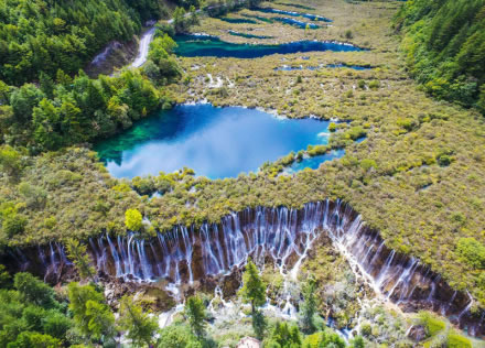 樹正群海海拔2187—2280米。其地形是在河谷迭加泥石流堆積物基礎(chǔ)上,再經(jīng)鈣華沉積,形成大小19個湖泊,順著溝谷層層迭迭。該處森林、湖泊、小瀑布相錯相連,呈現(xiàn)“樹在水中生,水在林間流,人在畫中游”的奇特景觀。