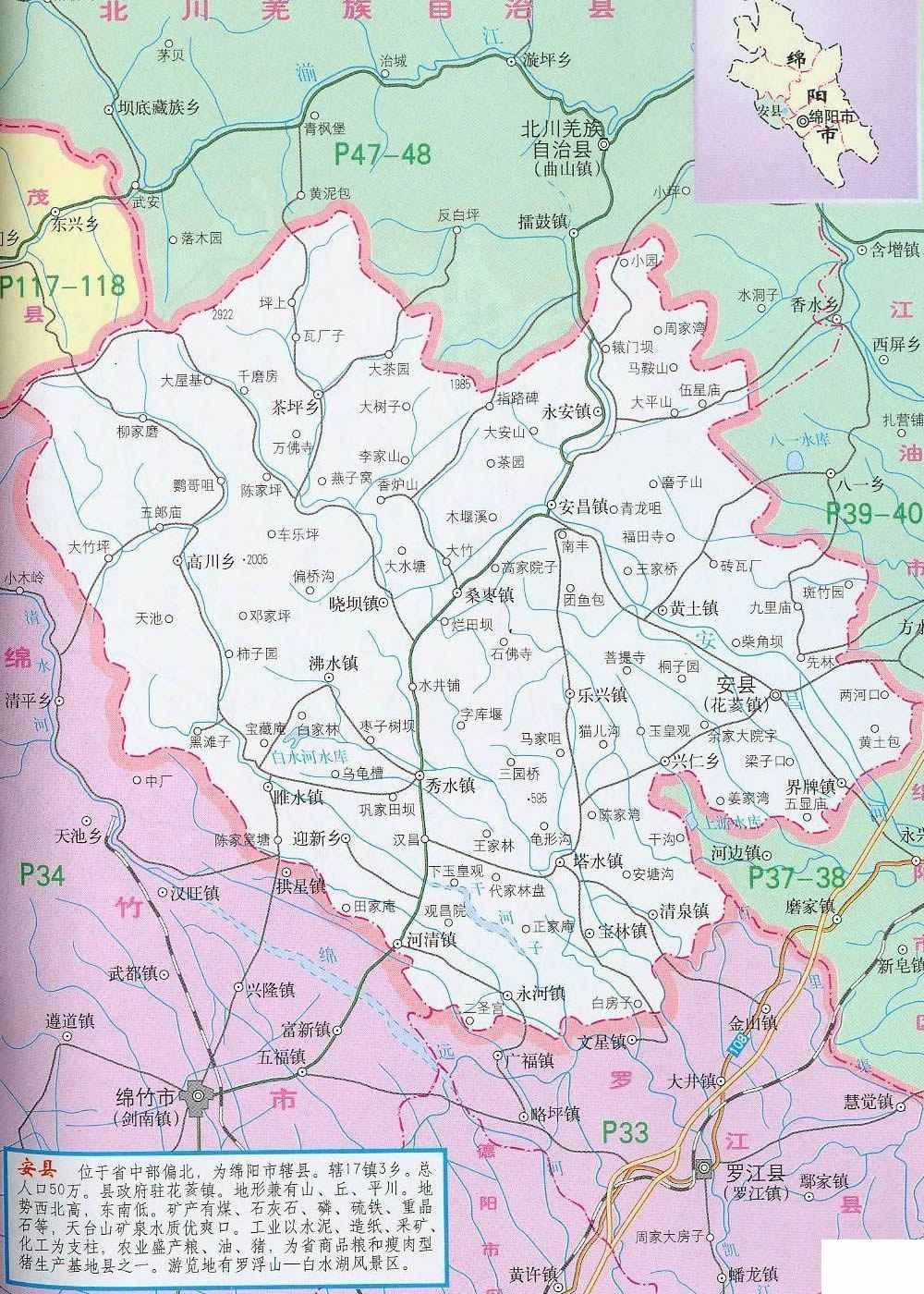安縣位于四川盆地西北部,距成都110公里,距綿陽科技城10公里。縣境山丘壩兼有,幅員1404平方公里?側丝50萬人,轄4鄉(xiāng)16鎮(zhèn)。安縣氣候宜人,生態(tài)環(huán)境優(yōu)美。屬亞熱帶濕潤季風氣候,氣候溫和,雨量充沛,四季分明,日照充足,無霜期長。年均氣溫16.3℃,年均降水量1260mm,空氣質量常年達國家二級標準,森林覆蓋率達42%?h內交通四通八達,人流、物流進出快捷方便 ,現(xiàn)代通訊覆蓋全縣,并開通了ADSL業(yè)務和高速寬帶網絡,光纖有線電視遍布城鄉(xiāng)。自然資源豐富,有水泥石灰石、磷礦、煤、硫鐵礦、重晶石、鋁土礦等礦產資源29種,儲量豐富;有動物資源948種,其中大熊貓、金絲猴等國家一、二級保護動物77種;有植物資源814種,其中銀杏、珙桐等國家一級珍稀植物及棗皮、杜仲、烏藥等中藥材資源100多種。工業(yè)基礎良好。電子、建材輕化、能源、化工、食品等支柱工業(yè)日益壯大。農業(yè)生產條件優(yōu)越,農村經濟持續(xù)發(fā)展。雜交水稻制種、優(yōu)質水稻、無公害蔬菜、水果、無規(guī)定疫病畜禽養(yǎng)殖、水產、蠶桑、魔芋、棗皮等農業(yè)產業(yè)化經營蓬勃發(fā)展。