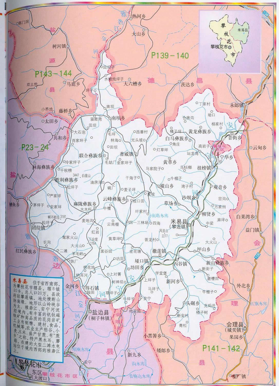 米易縣轄7個(gè)鎮(zhèn)、1個(gè)鄉(xiāng)、4個(gè)民族鄉(xiāng):