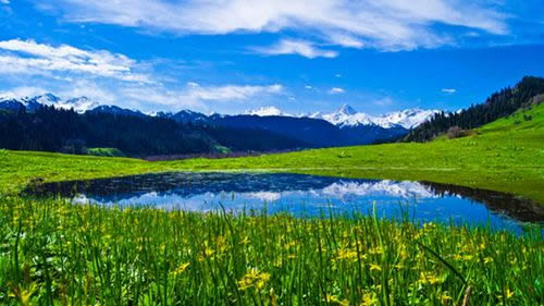 從闊谷東側(cè)穿林攀山而上,眼前一望無際,遼闊美麗的草原就是頗具勝名的庫爾德寧大草原。草原上山花爛漫,牛羊蠕動(dòng),群馬奔騰,處處都是“風(fēng)吹草地見牛羊”的動(dòng)人景象;山灣溪畔,密林排映之下是氈房點(diǎn)點(diǎn),炊煙裊裊;極目遠(yuǎn)眺,天際處,皚皚雪峰在陽光照射下,幻化出五顏六色的光芒;齊齊的林線下是郁郁蔥蔥,綿延不絕的茫茫林海;藍(lán)天上,白云朵朵,雄鷹展翅翱翔;在草原西南側(cè),鑲嵌著一面園月以的小湖,水平如鏡,清澈見底,天光云彩,湖中徘徊,詩情畫意油然而生。日暮時(shí)分,夕陽如血,霞飛滿天,光移景動(dòng),山色朦朧,群山露紅,層林盡染,更是難得的景致。庫爾德寧草原風(fēng)光無限,美麗如畫,令人目不暇接。